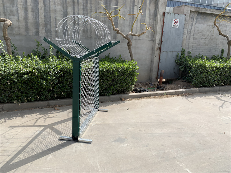 立柱:60*80mm,80*80mm,80*100mm,100*100mm等矩形鋼,或者采用70mmX100mm的掛式連接立柱。頂部焊有V型之架,用以架設蛇腹型刀刺網。產品均為熱鍍鋅后采用的聚酯粉末靜電噴涂。