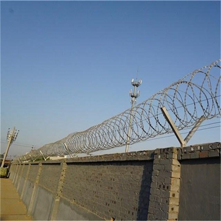 刀刺網(wǎng)的樣式一般分為不銹鋼和鍍鋅這2種材質(zhì),常用鍍鋅的,但是在一些天氣條件比較惡劣的條件下(比如日照時(shí)間長(zhǎng),或白天晚上溫度相差大,還有是陰天多雨潮濕的地域),還是建議使用不銹鋼材質(zhì)。安裝間距不宜少于250px,圈距排列應(yīng)均勻,刀片形式宜為BTO-22(芯線直徑2.5mm±0.1mm,刀片厚0.5mm±0.05mm,刀片長(zhǎng)22mm±1mm,刀片寬度15mm±1mm,刀片間距36mm±1mm),用于支撐刀刺網(wǎng)的支架伸出刀刺網(wǎng)長(zhǎng)度不應(yīng)大于50)mm;