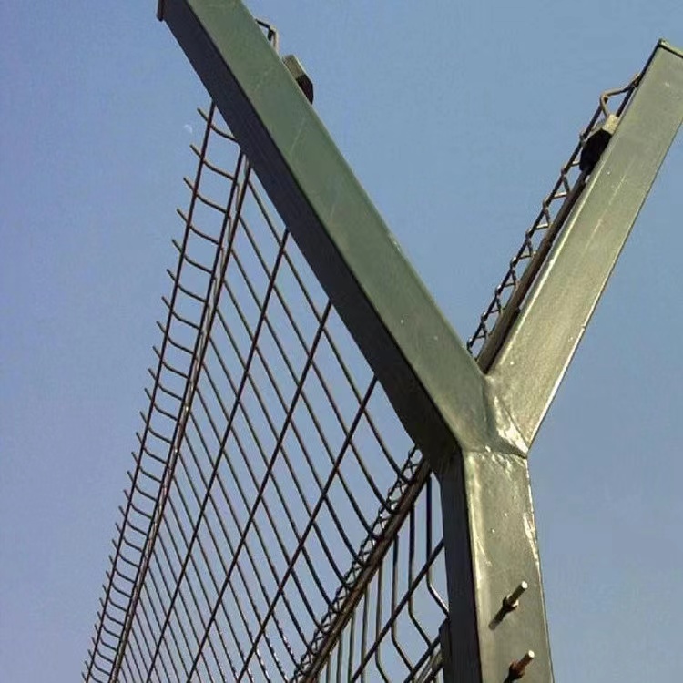 機場是一個對安全性要求高的場所,所以防護欄對于機場而言就是牢固的外墻 ,圍界隔離網又稱作"Y型安全防御護網”,是由折彎網片,V型支架立柱,加強型焊接片網,上面有刀片刺繩(又稱刀片網,刀片護欄)安全防盜連接件組成強度和安全防御性