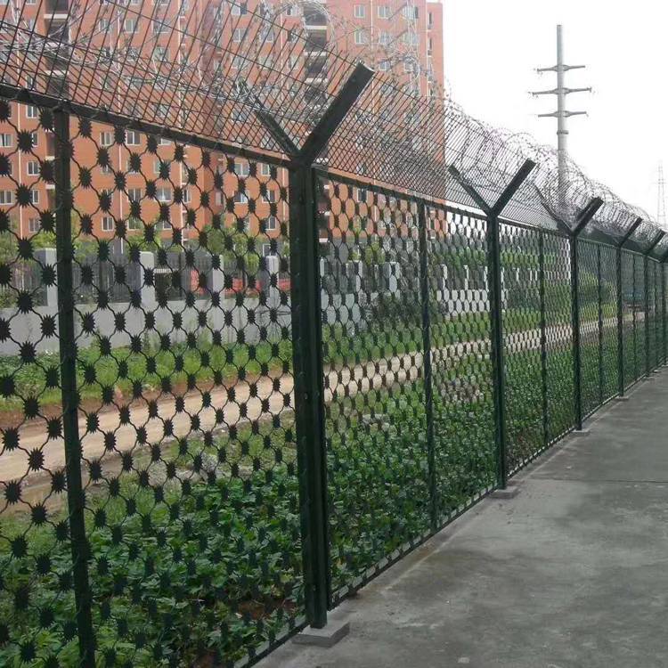 梅花刺隔離網的立柱通常采用80*80*3mm方管,網片根據高度可分為一片式結構也可分上下兩層結構,邊框:40*40*2.0mm低碳鋼矩形管,中間加一根豎向支撐。絲徑為5.0m,網孔 100*100m,刺片直徑75,厚度為 1.2mm,將網絲、刺片、方管焊為一體,邊框與立柱通過邊耳無縫連接,采用不銹鋼專用防盜螺栓連接,頂部刀片滾刺網采用型號BTO一22,芯絲直徑2.5mm。刀長22m,刀寬15m,厚度0.5m,刀間距 35m。雙螺旋,直徑中600m,密度 10 圈/米,圈距排列均勻,相鄰每圈間距不大于200mm。材質采用不銹鋼 304。