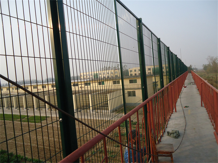 看守所隔離網高度總體高度一般為:2.5米--4米高,立柱跨度間距為3米,邊框為20X30方管,也有使用30X30或者30X50的方管網孔為:70X150mm、50X100、60X120等,絲徑為:4mm-6mm,立柱規格為:60X60、80X80、100X100方柱,V字高度為:50cm,立柱壁厚:2mm-3.5mm,法蘭盤規格為:200X200X10mm,整體全部采用鍍鋅材質浸塑或者靜電噴涂。連接方式網片邊框打孔。立柱焊接邊耳用螺絲連接。頂部加焊大V字型網片,用來支撐蛇腹型刀刺網,蛇腹型刀刺網材質為熱鍍鋅或不銹鋼,使用壽命長,這樣組裝起來的監獄隔離網堅不可。