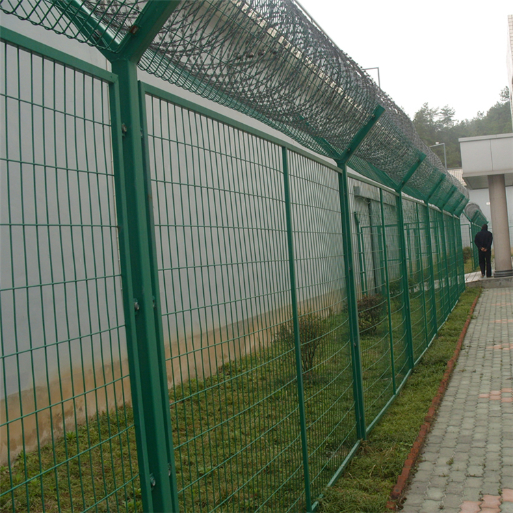 看守所圍網又稱作安全防御護網,是由安全立柱(頂部可帶V型),加強型焊接片網,安全防盜連接件和刀片刺籠組成,強度和安全防御級別很高。近年來,被廣泛應用在監獄,看守所,軍事基地等高安全場所。表面采用電鍍、熱鍍、噴塑、浸塑等防腐形式,具有很好的抗老化、抗曬、耐候等特點。這種看守所安全圍網造型美觀、花色多樣,既起到圍欄作用,又起到美化作用。由于具有安全性高、防攀爬能力好,網片連接方式采用特制SBS緊扣件,有效防止人為的破壞性拆卸,橫向四道折彎加強筋或四周焊接方管邊框,使網面強度顯著增加。
