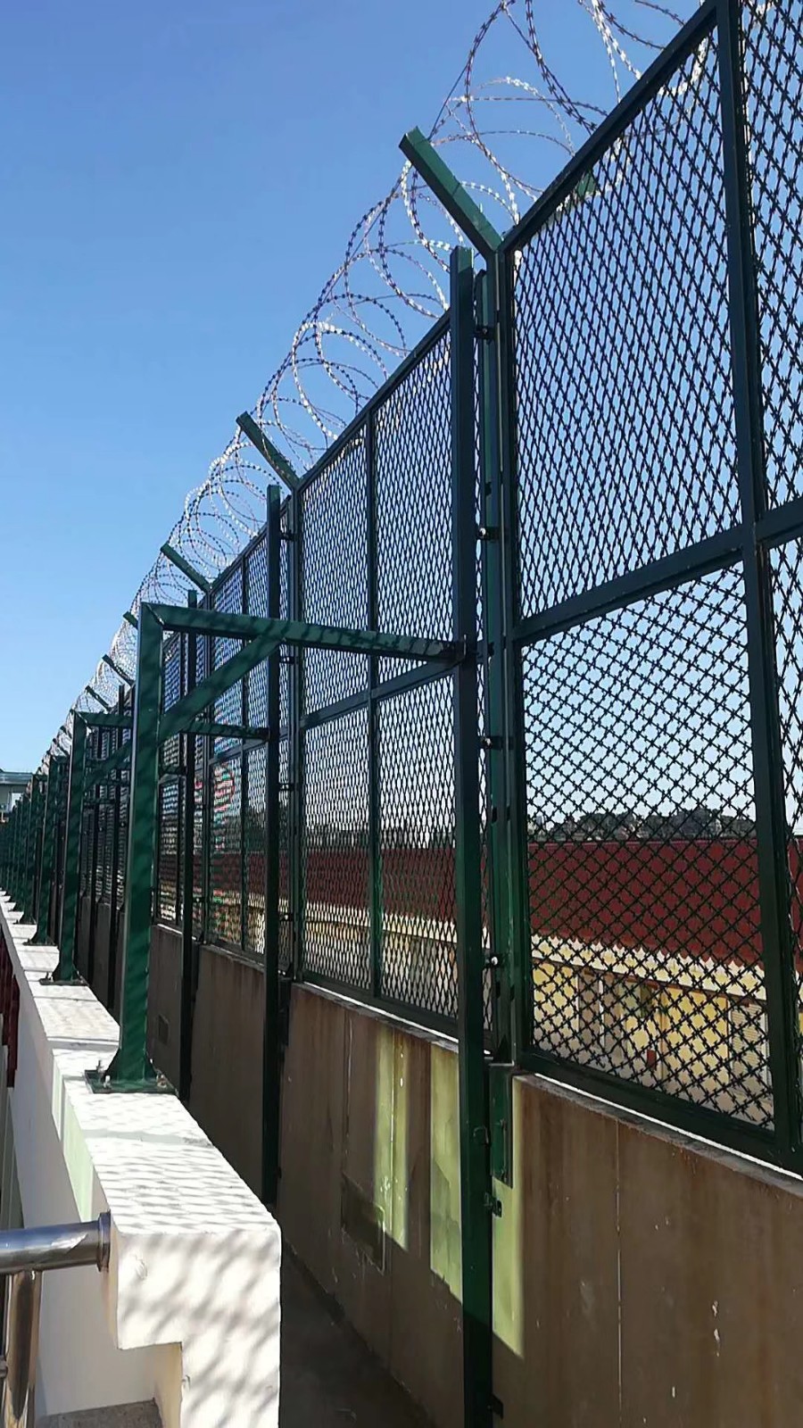 監獄除了358密紋網,焊接網片還有一種新形式的網片叫焊接刀刺網,是用刀刺網直接焊接到方柱上