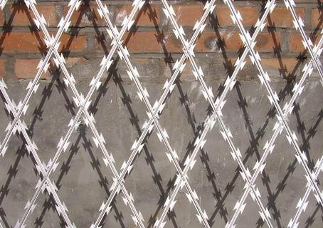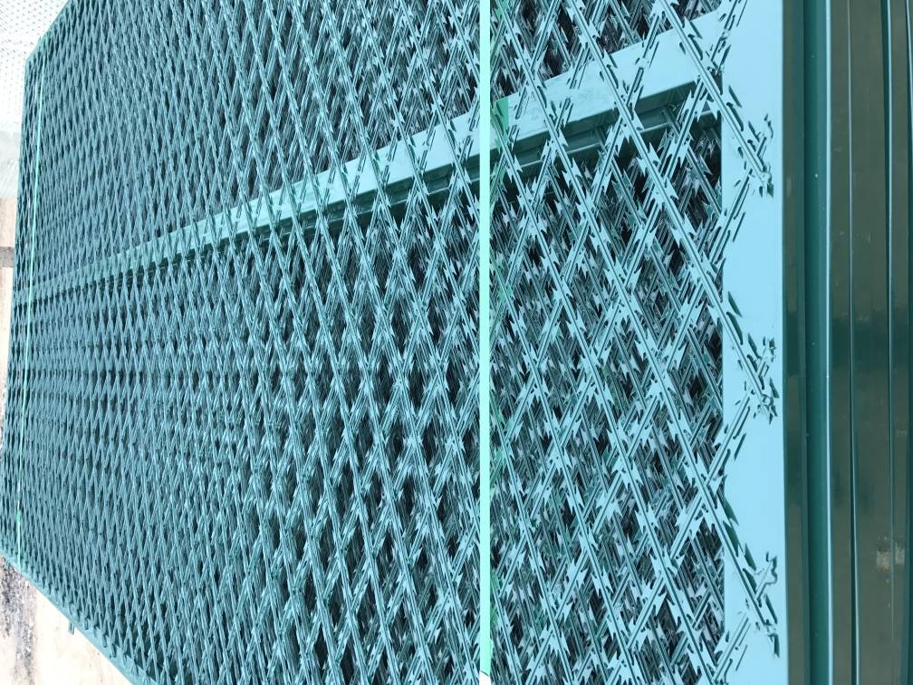 而且刀刺網一般采用熱鍍鋅和不銹鋼沖壓而成,更具有防腐性。它擁有尖銳的刀片張力鍍鋅鋼絲或者不銹鋼絲做芯線組合而成的產品。網孔大小可根據客戶要求加工,一般7.5cm*15cm5cm*10cm是巡邏道常用網孔。由于刺網的形狀很特別,而且每個角度都有尖狀刀片,因而能達到很好的防御保護效果,然后打磨焊接口,做刀片式焊接隔離網防腐防銹處理,采用噴涂處理。