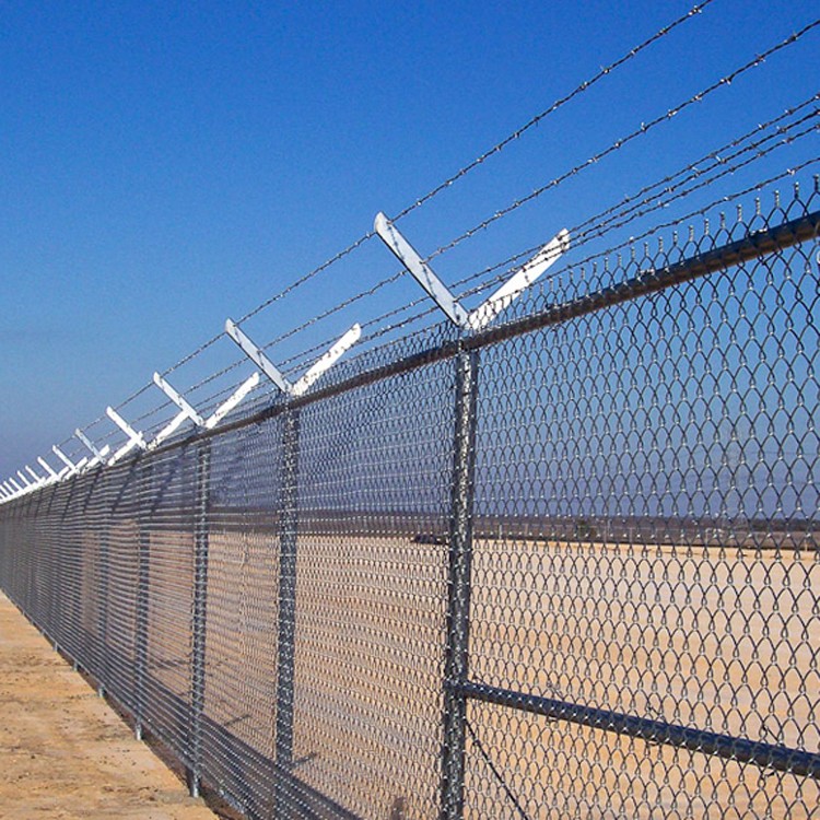 2、機場護欄也可以用倒鉤樁,用三線倒鉤線固定。機場柵欄可以用焊接的網板,也可以用鏈條網