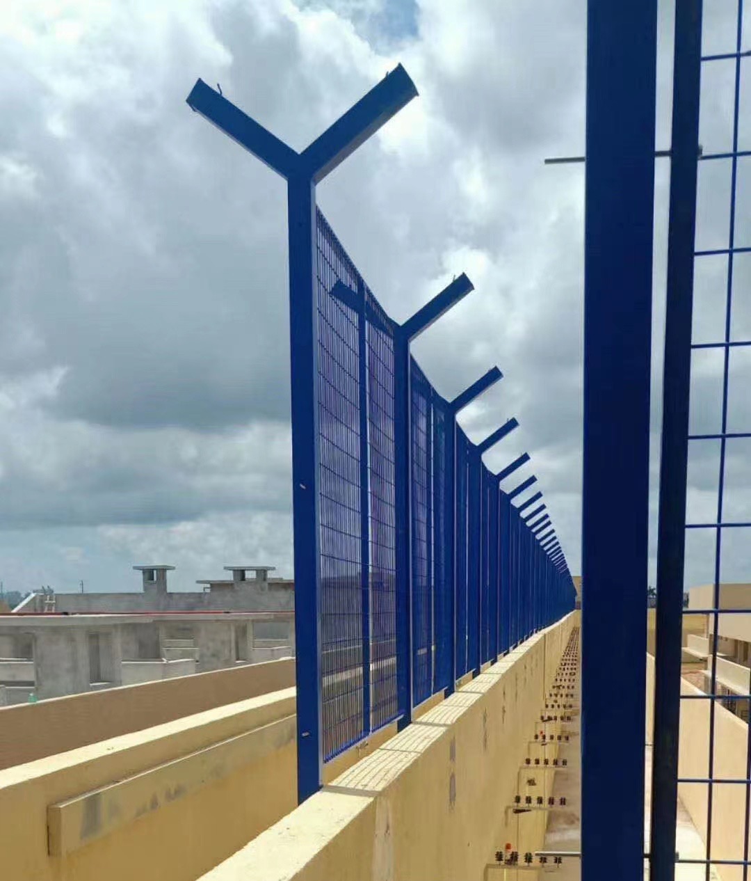 立柱的頂部焊接V型支架(這種立柱也叫做Y型立柱),用來架設蛇腹形刀刺網,與下方的隔離網結合,形成一道難以逾越的銅墻鐵壁。