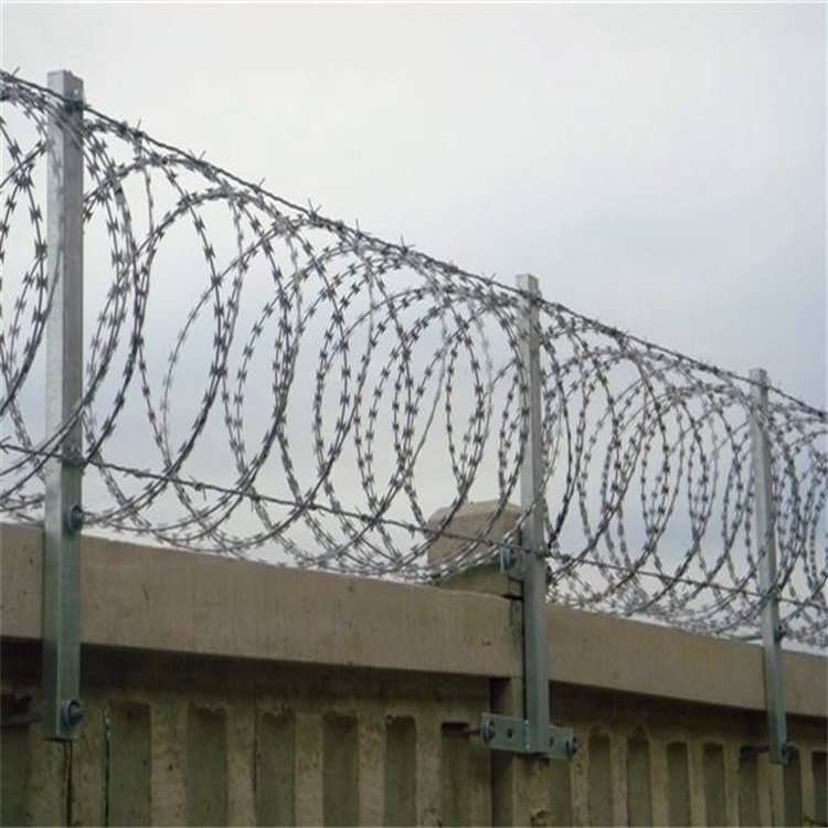 刀刺網是由熱鍍鋅鋼板沖壓而成,形成一個刀片狀的籠子。在用卡扣卡好,接下來為大家舉例在鐵路上如何安裝:加密支架采用矩形鋼管。安裝時,支架和加密支架用直徑為8 mm的U形箍固定在混凝土防護欄頂部。為了降低成本,更好地保證質量,在鐵路線上安裝水泥防護柵欄后,上方可以安裝刀刺網,采用φ2.5mm鍍鋅鋼(或不銹鋼絲)兩圈固定橫向鋼絲上,用卡扣連接。安裝時帶手套,防止割手。刀片卡口由尖角鍍鋅鋼或不銹鋼制成(304不銹鋼、201不銹鋼)。交叉圈之間的中心距離為34mm。打開后,形成蛇網。開孔后,每個十字圓的安裝距離為20cm,直徑不小于45cm。