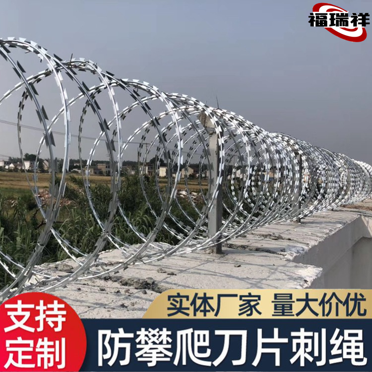 刀片刺繩是總體來說只要你需要安全防御的地方就可以使用,因為不限場地、不限地點。易安裝,易搬運。用在監獄護欄網頂端的刀片刺繩,它是一種近年發展起來的防護、隔離能力較強的新型防護網產品。它采用鋼板沖壓成型包附于鋼絲之上,由銳利尖角鍍鋅鋼板或不銹鋼薄板做刀片,高張力鋼絲做芯線組合而成的。根據形狀可分為:螺旋式-刀片刺網、交叉式-刀刺網、平板式-刀片刺網、直線式-刀片刺網。