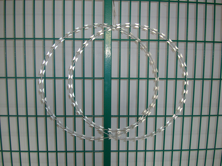 滾網刀片是一種近年發展起來的防護、隔離能力較新型防護網產品。它采用鋼板沖壓成型包附于熱鍍鋅鋼絲(筋絲)之上,銳利尖角鍍鋅鋼板或不銹鋼薄板做刀片,高張力鋼絲做芯線組合而成的。鋒利的刀型刺由雙線扣裝后成蛇腹狀,既美觀又讓人不寒而栗。起到了很好的阻嚇作用。