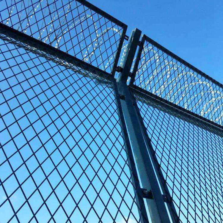 監獄鋼網墻款式-梅花刺鋼網墻作用總體的有,普通監獄鋼網墻,太陽花刺鋼網墻,菱形焊接刀片刺網,螺旋式刀片刺鋼網墻,鍍鋅358監獄防攀爬鋼網墻等等,但總得來說,要有大于5.0mm粗的絲徑,或者是刀刺網焊接,另外立柱不得少于2.0mm壁厚,直徑不低于60*60mm,頂部加裝V型架,在頂部V型架上裝有刀刺網;而對于太陽花刺鋼網墻來說,在網片的絲和絲的交叉處,焊接類似太陽花的刀片,起到防攀爬的作用。
