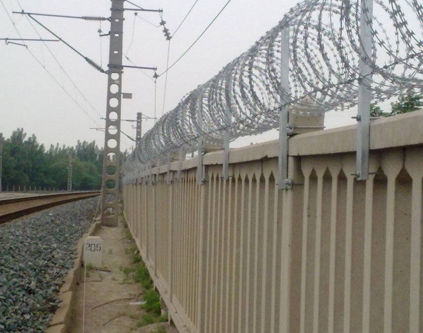 鐵路刺絲設(shè)置規(guī)范:鐵路刺絲滾籠采用刀片刺繩繞圈后相臨兩圈每隔120mm用刺絲連接卡固定,張開(kāi)后形成蛇腹網(wǎng)狀,閉合后刀片刺繩圈徑為500mm,張開(kāi)后每交叉圈安裝間距200mm,直徑不小于450mm。鐵路刺絲滾籠由刺絲連接卡扣與固定在支架上的縱向拉筋相連接,縱向拉筋與支架的連接采用02.5mm的冷拔鍍鋅鋼絲繞2圈后寧緊固定,支架設(shè)置在跨度3m防護(hù)博欄的立樣和跨中位置,其他跨度僅設(shè)置與立樣上部,支架與防護(hù)機(jī)爛采用支架拘籍連接。鐵路刺絲滾籠刀片刺繩由沖切鋼板采用機(jī)械壓軋?jiān)阡摻z上成型,刀刺寬度22mm,兩刃垂直間距15mm,刀刺縱向間距34m.芯絲直徑為2.5mm。刀片采用厚度0.5mm的Q195鋼板沖切制作,芯絲由HPB30006.5mm高線鋼絲加工.