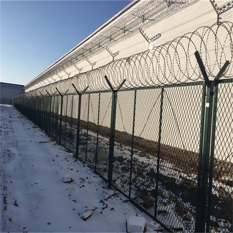 云南看守所鋼網墻采用高強度的刀片刺網與普通防護網的結合,由V型支架立拄,加強型焊接片網,安全防盜連接件和組成。監獄護欄網網格結構簡練、便于運輸、安裝不受地形起伏限制,特別是對于山地、坡地、多彎地帶適應性強。螺旋型交叉刀片刺網是在兩條刀片刺網之間以不銹鋼片和鍍鋅鋼片強力夾扣,展開后即呈交叉狀,美觀又實用。